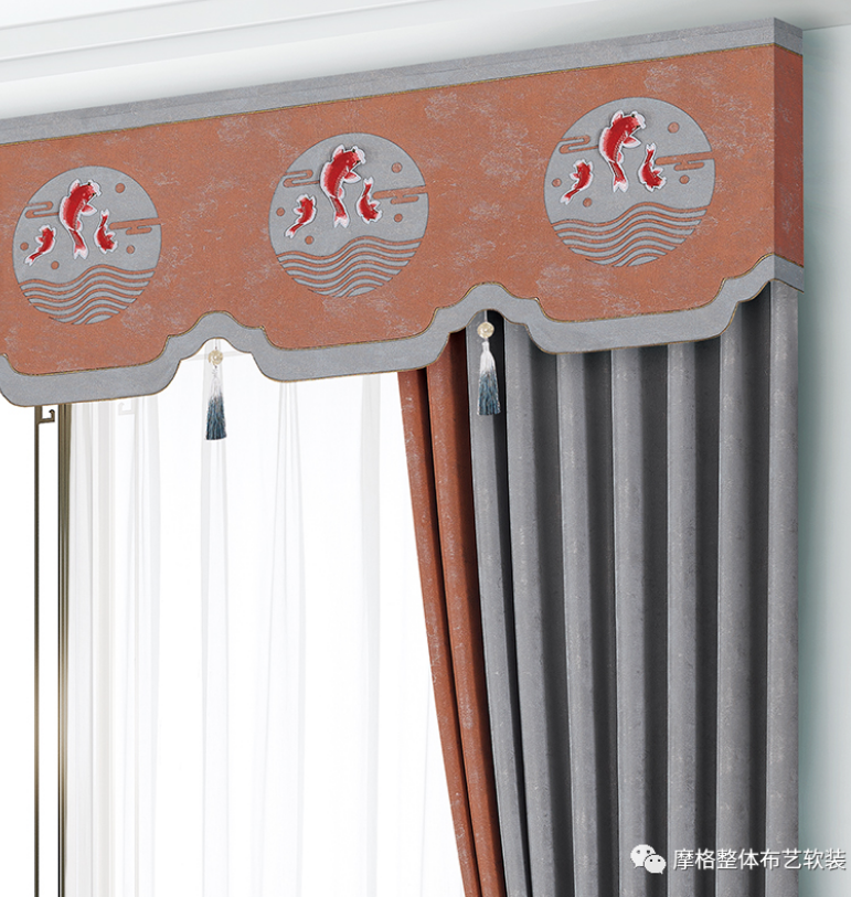 帘头采用激光雕刻技术,雕刻出云纹和水波浪纹来勾勒整个空间,圈中采用大理石灰打底,几只锦鲤怡然其中。